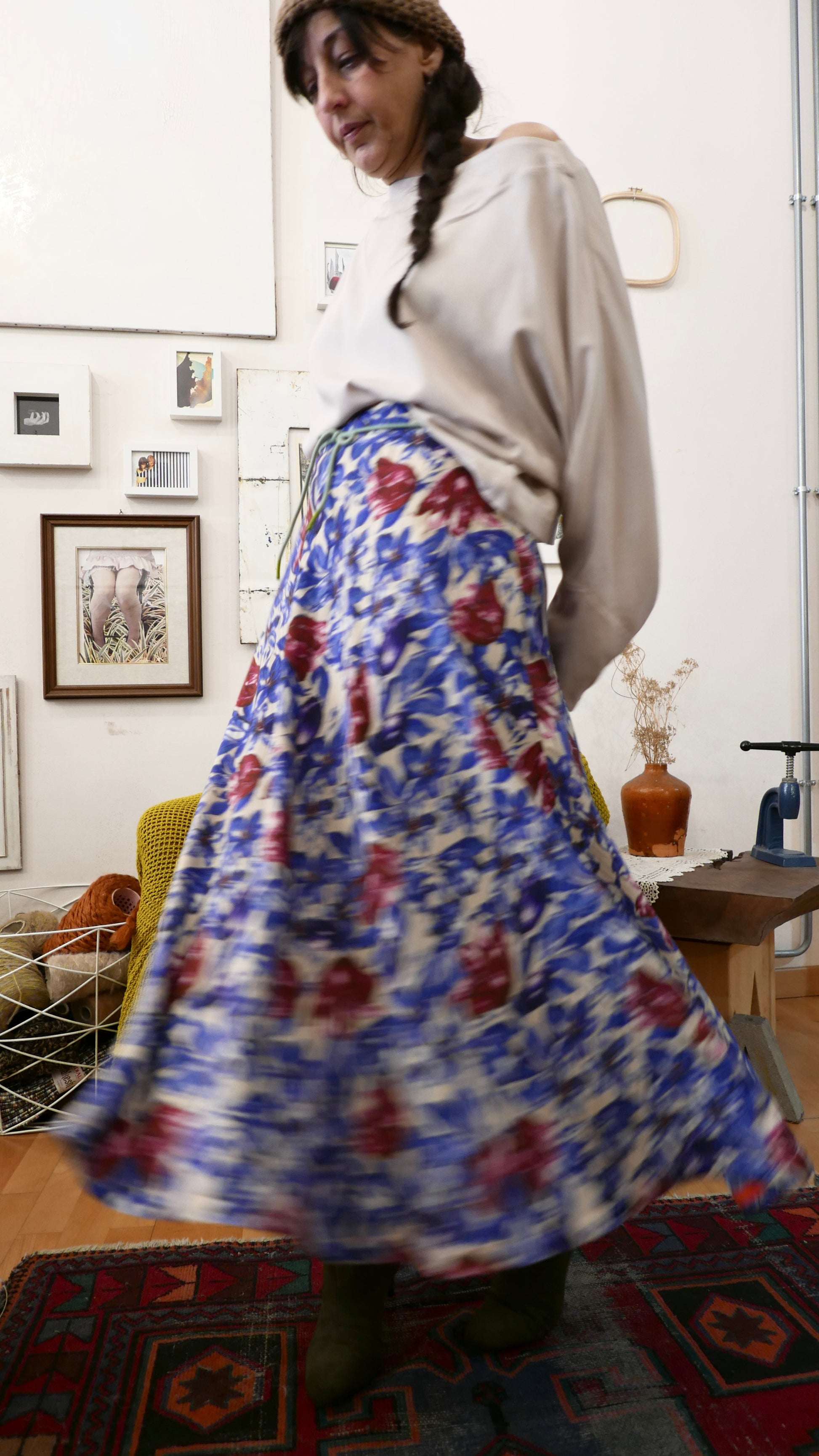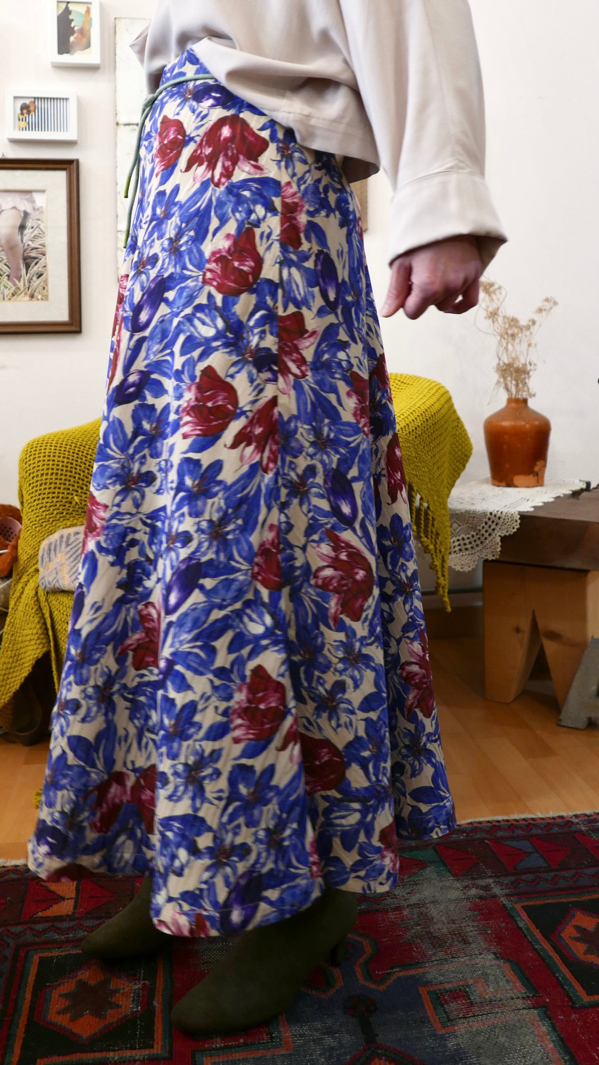 Gonna in viscosa stampata su tessuto jacquard lavorato.